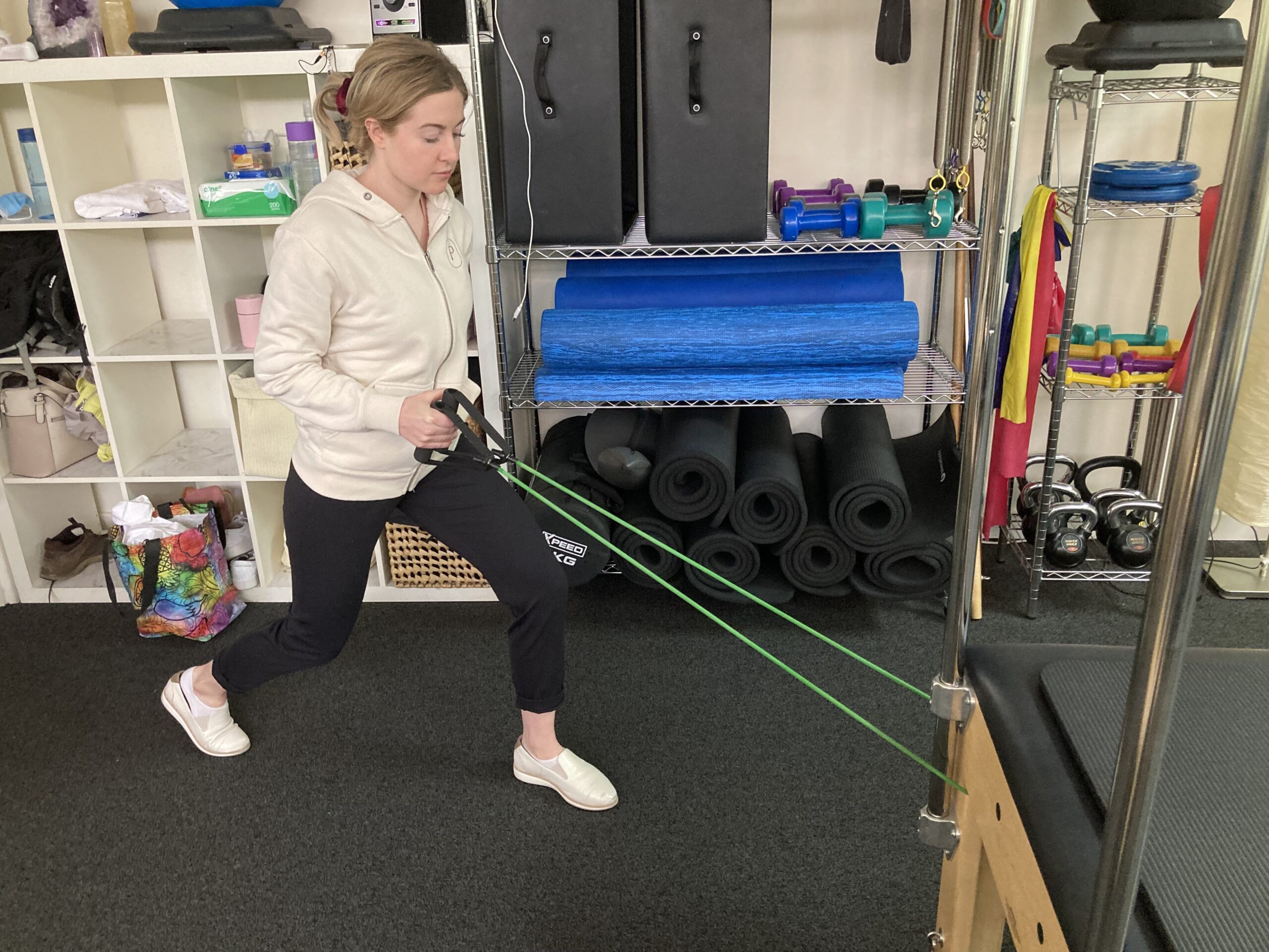 Band, cable, and dumbbell work can be performed to develop 3D weight bearing strength and mobility. Think squats, steps, side lunges, side steps, rotation band pulls and multidirectional steps with dumbbells. Slider machines are also a great tool to incorporate. Balance and single leg control work will do wonders and, for the more athletic, plyometric work (e.g., jump and land) are higher end goals.